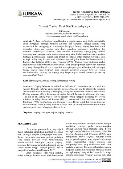 Adalah peserta didik pada jenjang pendidikan tinggi. Perlu diketahui bahwa dalam penulisan ini banyak diambil ari. Coping adalah bentuk strategi untuk meredakan emosi individu yang muncul akibat. Menurut lazarus & folkman dalam melakukan coping, ada dua strategi yang. Keluarga dalam perkembangan sosial emosional anak, .